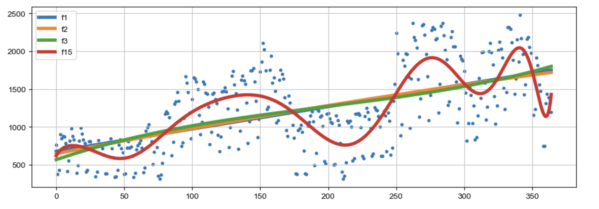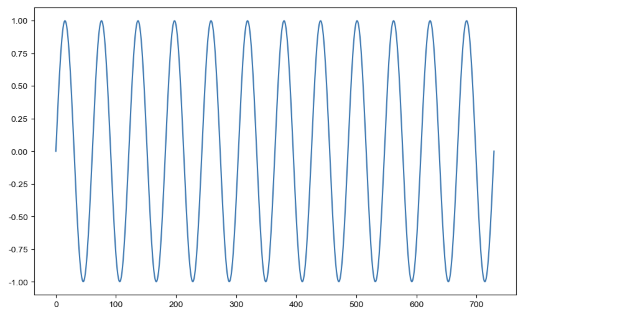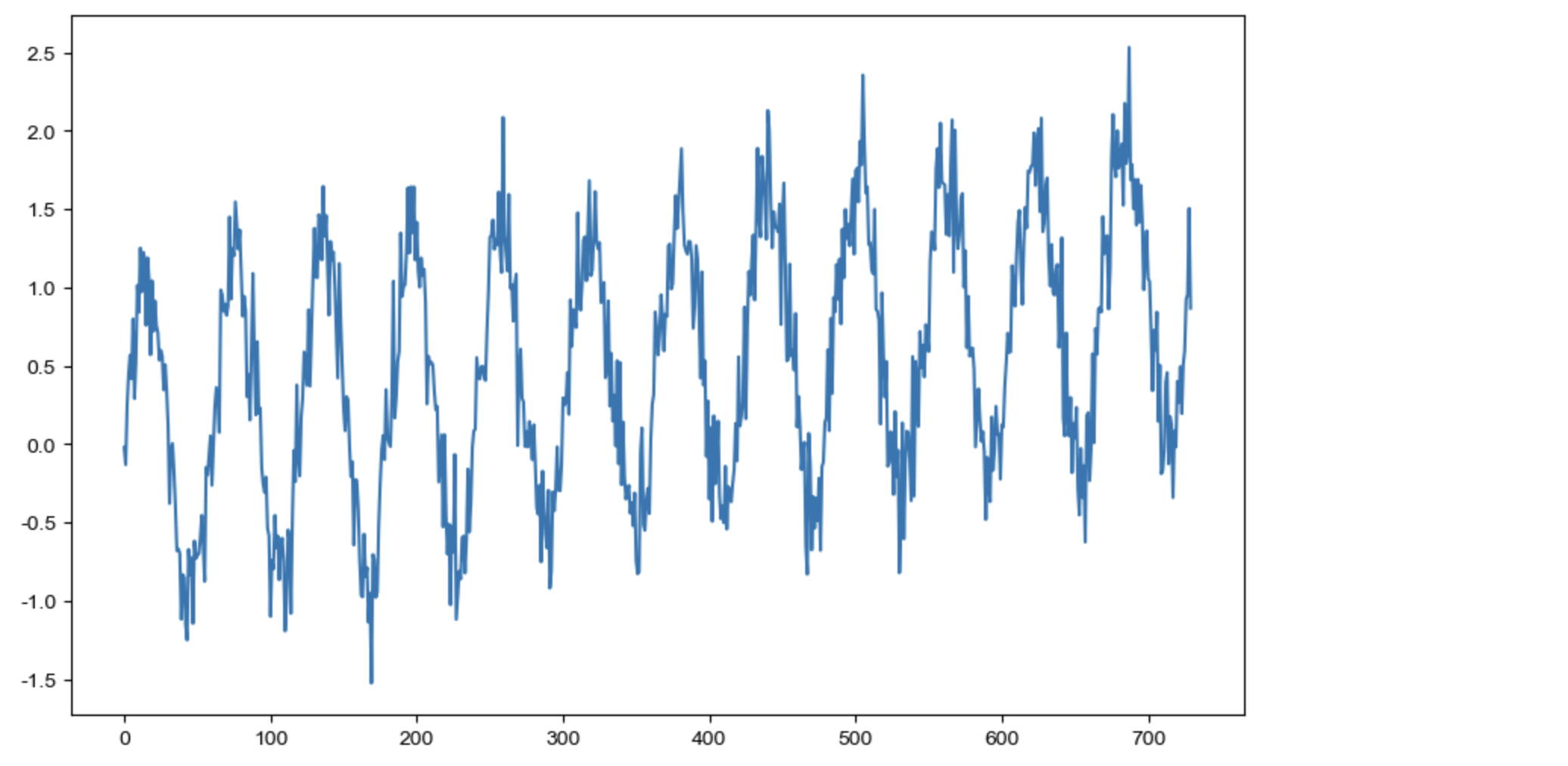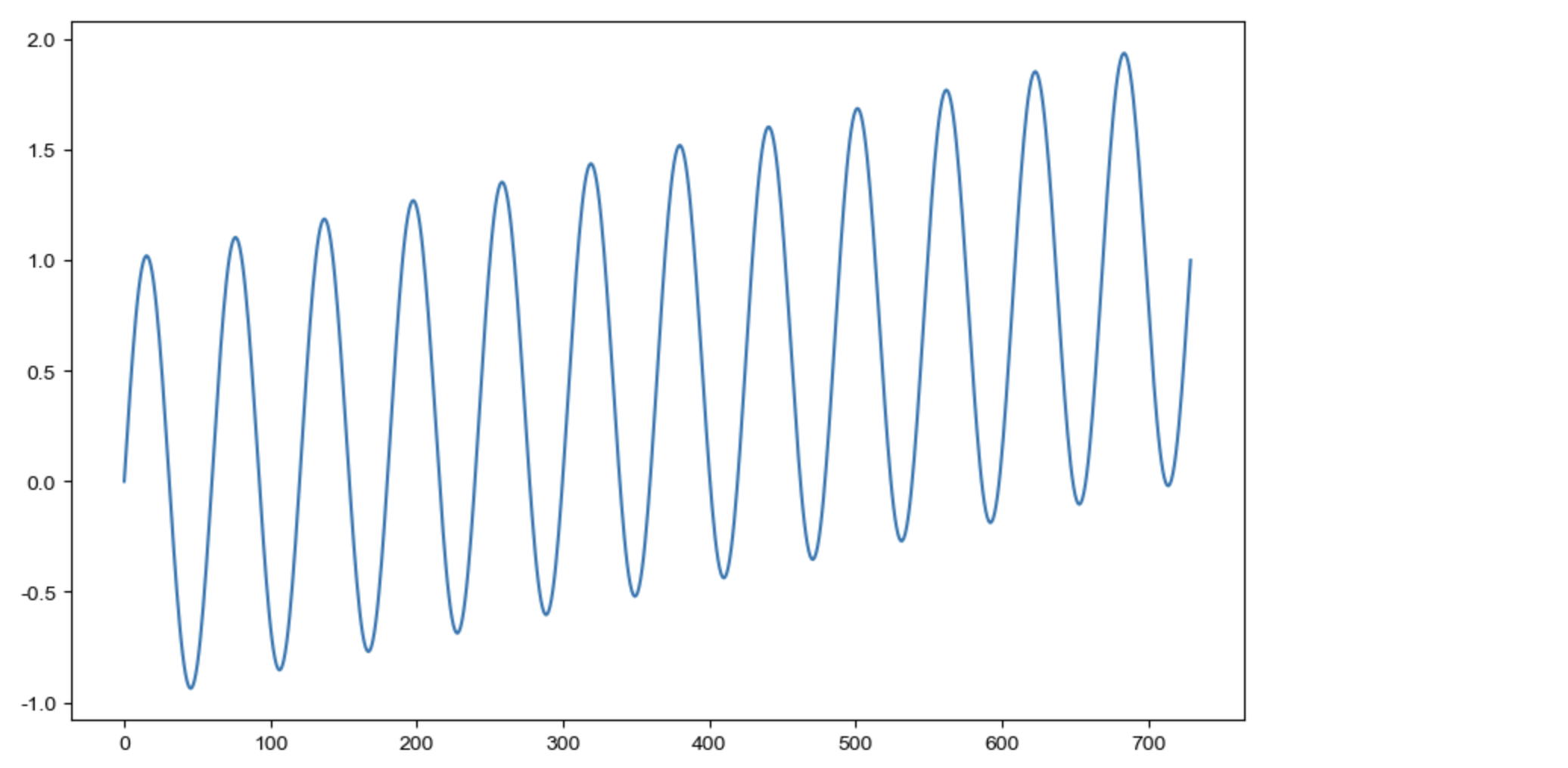 result = np.sin(2*np.pi*12*time) + time + np.random.randn(365*2)/4