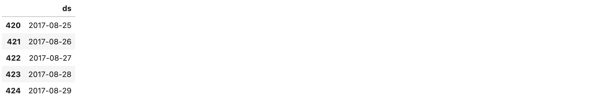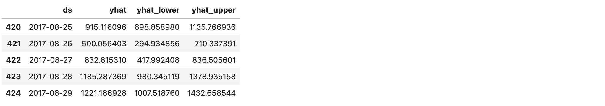 forecast[['ds', 'yhat', 'yhat_lower', 'yhat_upper']].tail()