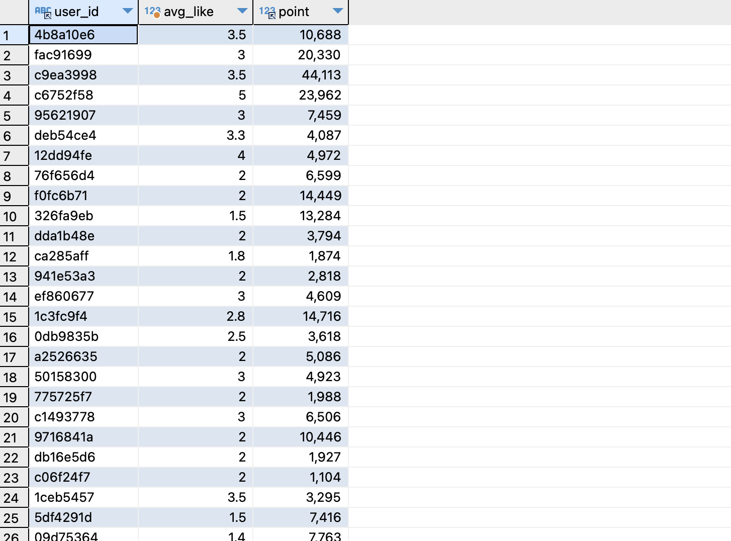 - 유저별 좋아요의 평균과 포인트를 조회하기 -