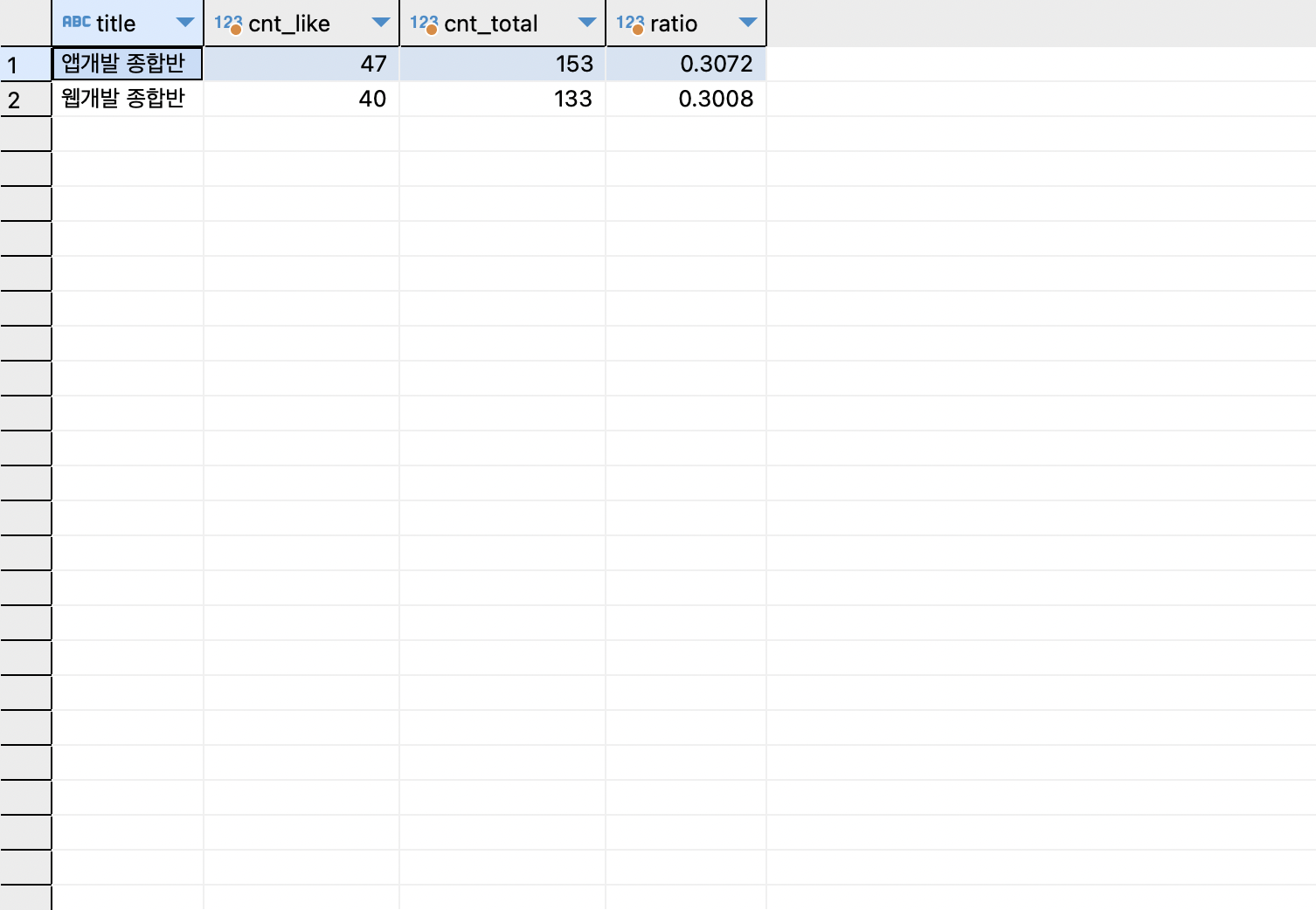 - 강의별 like 개수와 전체 인원, 비율을 구하기 -