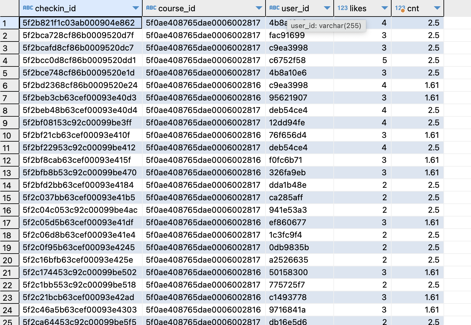 - checkins 테이블에 course_id별 평균 like수 필드 우측에 붙여보기 -